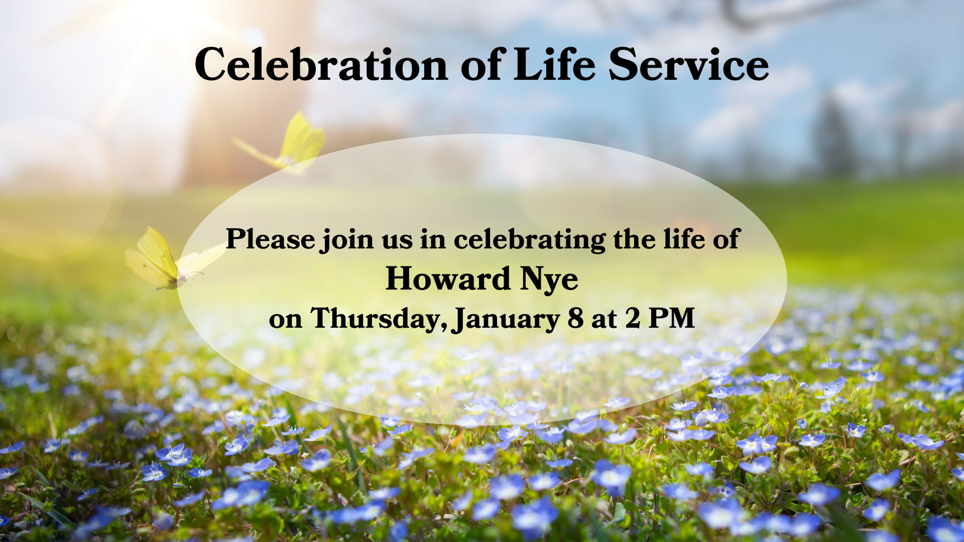 Please join us in celebrating the life of Howard Nye in the Sanctuary on Thursday, January 8th, at 2pm.